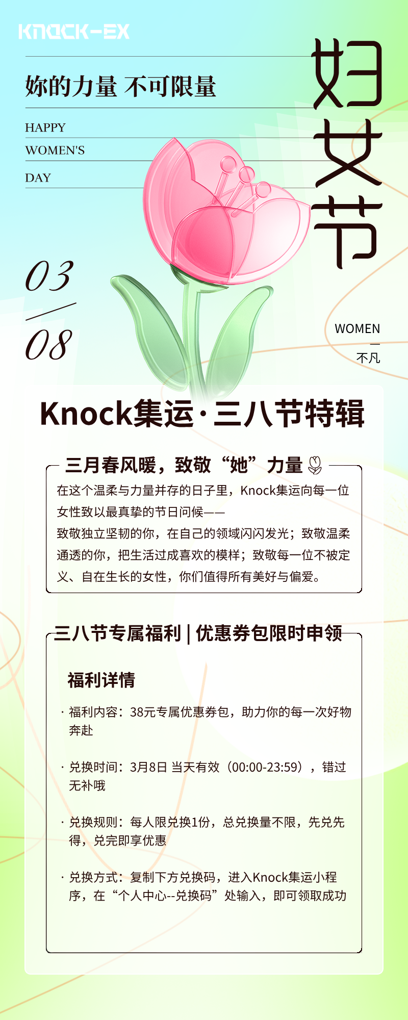 兑换码仅3月8日当天有效,请勿提前领取,以免无法获取福利,过期自动失效,请勿错过兑换时间;